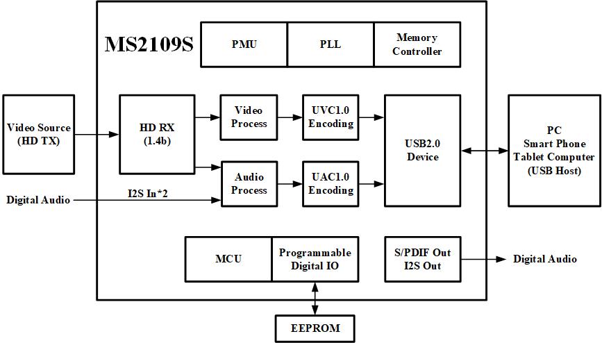 MS2109S是一款USB2.0高清音视频采集和混音处理芯片,内部集成USB2.0 Device控制器和数据收发模块、HD RX模块和音视频处理模块。MS2109S可以将HD输入的音视频信号通过USB接口传输到PC、智能手机或平板电脑上预览或采集。MS2109S支持两路I2S输入,1路I2S输出和1路S/PDIF输出,支持数字混音。MS2109S USB输出支持YUV422和MJPEG两种模式,兼容Windows、Android、Linux和macOS系统。