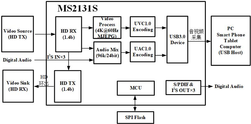 MS2131S是一款USB 3.0高清视频和音频采集处理芯片,内部集成USB 3.0 Device控制器、数据收发模块、音视频处理模块。MS2131S可通过USB3.0接口将HD输入音视频信号传送到PC、智能手机、平板电脑上预览或采集。MS2131S支持HD环出功能。MS2131S支持3路I2S输入,支持数字音频与HD 音频的混音处理,支持3路I2S输出,支持S/PDIF输出。MS2131S输出支持YUV422、MJPEG、RGB24和NV12四种模式,兼容Windows、Android和macOS系统。MS2131S内建MCU,支持功能定制和二次开发。