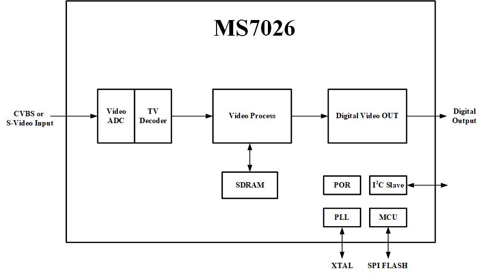 MS7026是一颗NTSC、PAL视频解码芯片。基于内部模式检测模块,对输入信号进行自动识别,并将其转换成数字8-Bit ITU-R BT.656信号。MS7026支持3D视频解码和隔行到逐行视频转换功能。