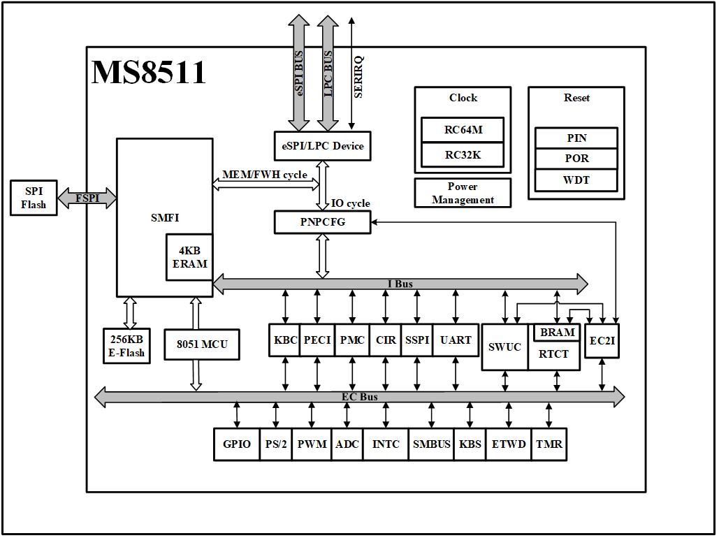 MS8511是一颗用于处理计算机系统任务的高集成度嵌入式控制器。基于8051核,通过eSPI或LPC和芯片组相连,用于系统开关机管理、电池管理、温度管理、键盘/鼠标/串口/通用IO等低速外设控制。MS8511内部集成KBC、PMC、PS/2、PWM、ADC、SMBUS、KBS、CIR、SPI、UART、Timer、PECI等模块,内建RC、POR、LDO等模拟电路,外围电路简单,支持省电模式。