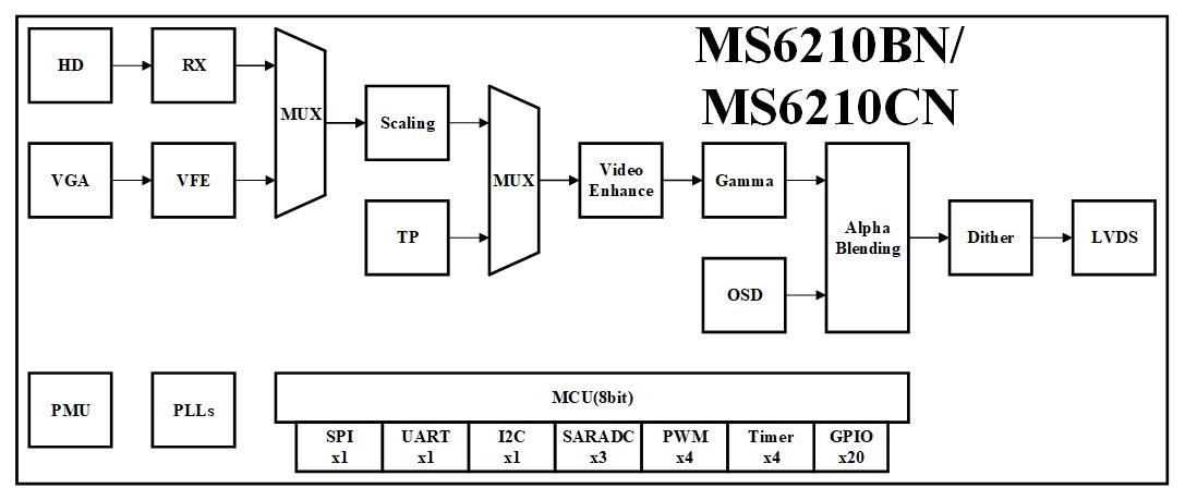 MS6210系列芯片内嵌可编程OSD和测试图片,集成1T 8051 MCU,扩展了UART、I2C、SPI、PWM、GPIO及ADC等外设接口,方便用户实现按键功能和显示屏背光控制功能。芯片内还集成1.2V电源模块,可降低系统成本。