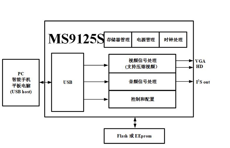 MS9125S是一颗USB投屏器芯片,内部集成USB2.0 控制器和数据收发模块、视频DAC、HD 接口和音视频处理模块,支持压缩视频传输,可通过USB接口显示或扩展PC、智能手机、平板电脑的显示信息到更大尺寸的显示设备上,支持VGA和HD视频接口。