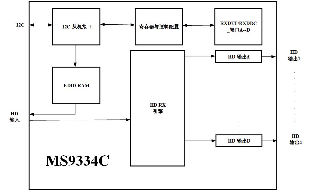 MS9334C是一颗最高信号速率可达3Gbps的HD信号1分4分配器芯片。在3Gbps的速率下,可支持4K x 2K@30Hz分辨率的HD输入信号,支持10/12/16位色深。HD输入端时钟与数据恢复功能可自适应不同长度、不同质量的线材,使得在高速率下传输的TMDS信号始终具有最佳性能。HD输出端具有信号预加重功能,可支持长线传输。内部集成EDID RAM。