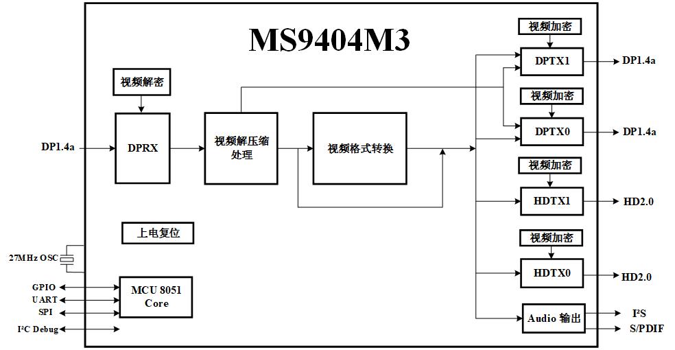 MS9404M3 是一颗DP1.4a Hub芯片,支持1路DP 1.4a输入,2路DP1.4a和2路HD2.0输出,内部集成DP接收和发送模块、解压缩DSC模块、视频格式转换CSC模块、视频加解密等模块,内嵌MCU。最高可支持3个输出端口扩展显示,DP通路最高支持7680 x 4320@60Hz带DSC压缩输出,HD通路最高支持3840 x 2160@60Hz输出。